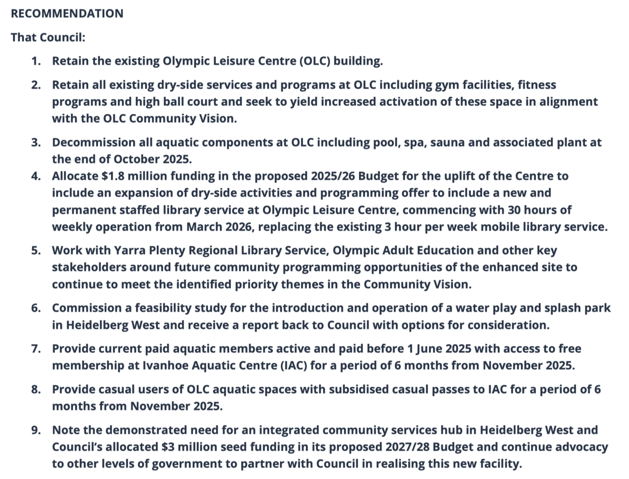 Banyule City Council are meeting on Monday 23rd June to vote on the future of OLC. They are proposing to close all aquatic facilities, abandon plans for major renovation, and instead fund a part-time library facility.