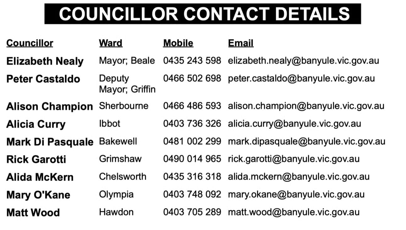 In the meantime, please contact Banyule Councillors and tell them to vote NO to recommendation 4.1.