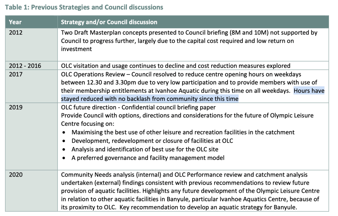Extract from Page 4, Olympic Leisure Centre Review, April 2025. Prepared by Otium Planning Group Pty Ltd for Banyule Council. (Attachment 4)